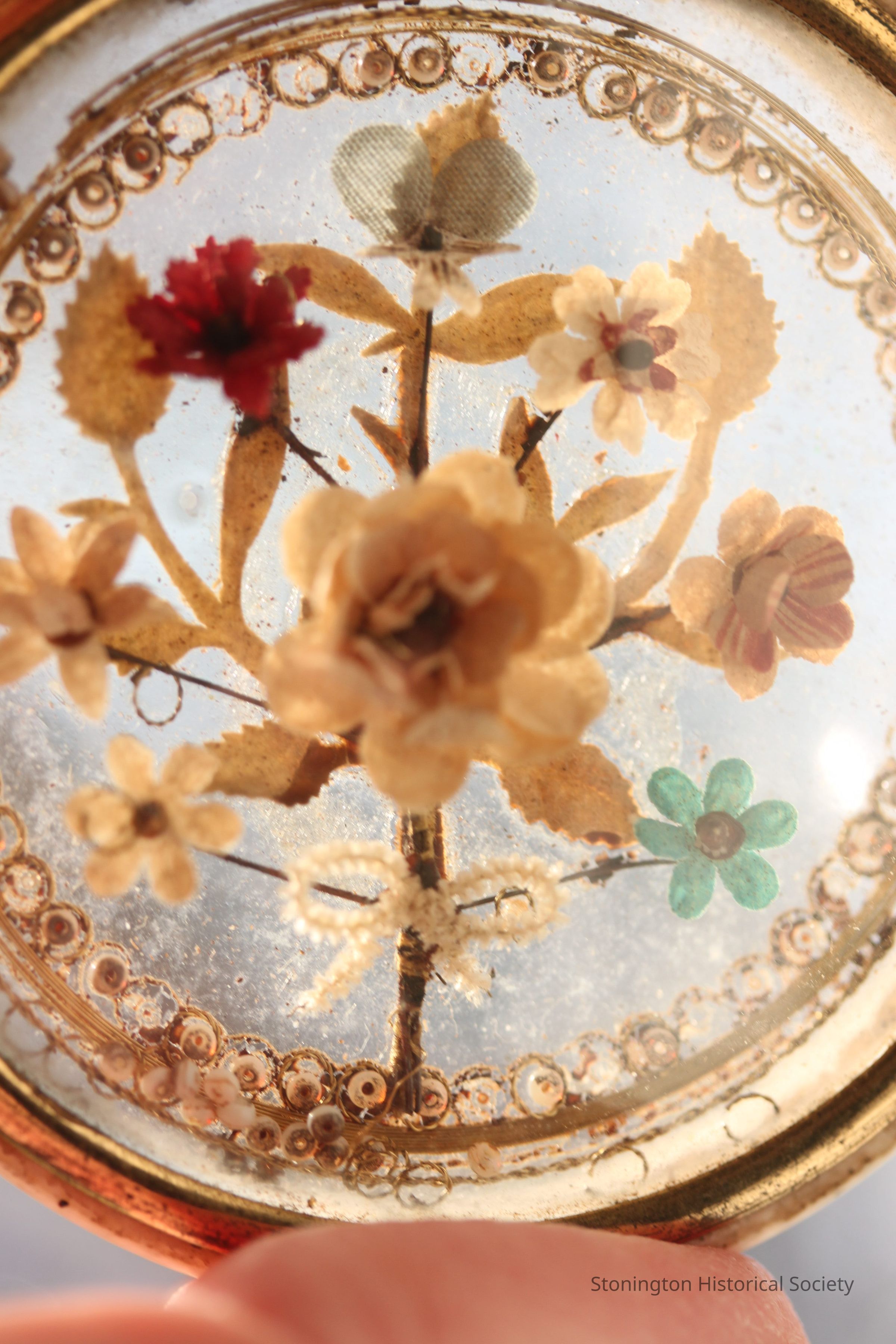 Snuff or patch box. Round ivory box topped by a glass dome attached to lid by a gold ring. Under the dome lid is a pink flower surrounded by smaller flowers of pink, red, blue and white (made of fabric?). The stem (made of wire) is decorated with a white bow (made of pipe cleaner?). The flowers are surrouned by small blue beads, many of which have come unglued. Incircled in gold braid. Once owned by the donor's mother, Catherine E. Stanton Thayer (Mrs. Jonathan W. Thayer), who was b. Stonington 1823 and died 1860.