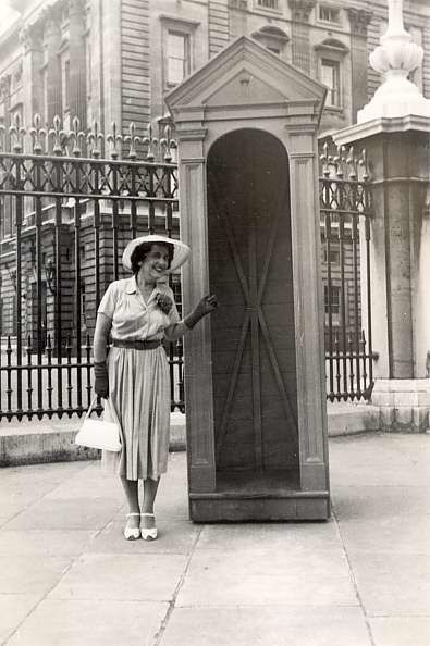 Dorothea at Buckingham Palace, next to sentry box August 15, 1953. Note on back. In section marked 1950s