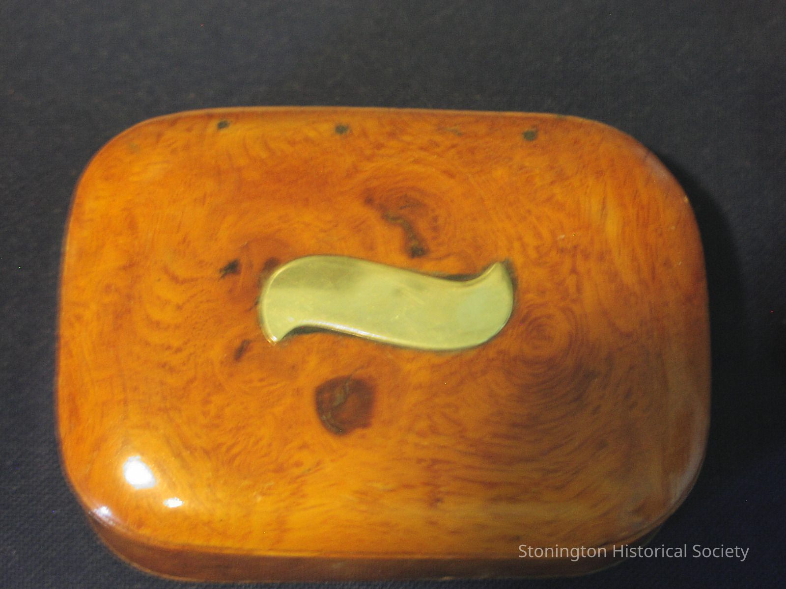 Retangular shaped snuff box with a brass embelleshment on the lid. Made from the Charter Oak, Hartford. It is lined with tortoiseshell. Once owned by the donor's father, Jonathan W. Thayer (b.1822, Braintree, Mass. - d. Stonington 1860).