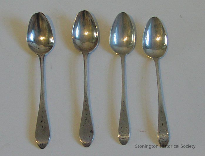 2 small spoons, silver, made by Enoch Stanton circa 1770 on the underside of the handle, 1 with "SWH" and the final with "A*M". Enoch was killed at the Battle of Fort griswold in 1781.