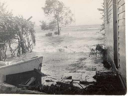 Small photo showing storm waves and boat next to house, August 31, 1954. Possibly Hurricane Carol? In section marked 1950s