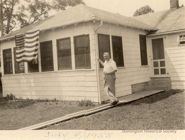Two part photo of Fred Gould standing outside of house July 4, 1955 In section marked 1950s