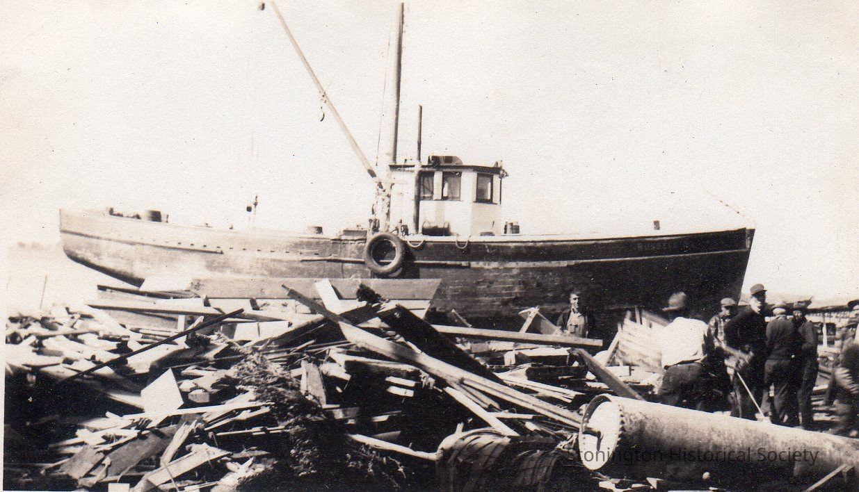 Black and white photograph of the RUSSELL S. washed up in the backyard of 92 Water Street following the 1938 Hurricane. From photograph album of Bertha D'Amico with handwritten caption: "Our Yard After the Hurricane, Taken from Under Sun Parlor."