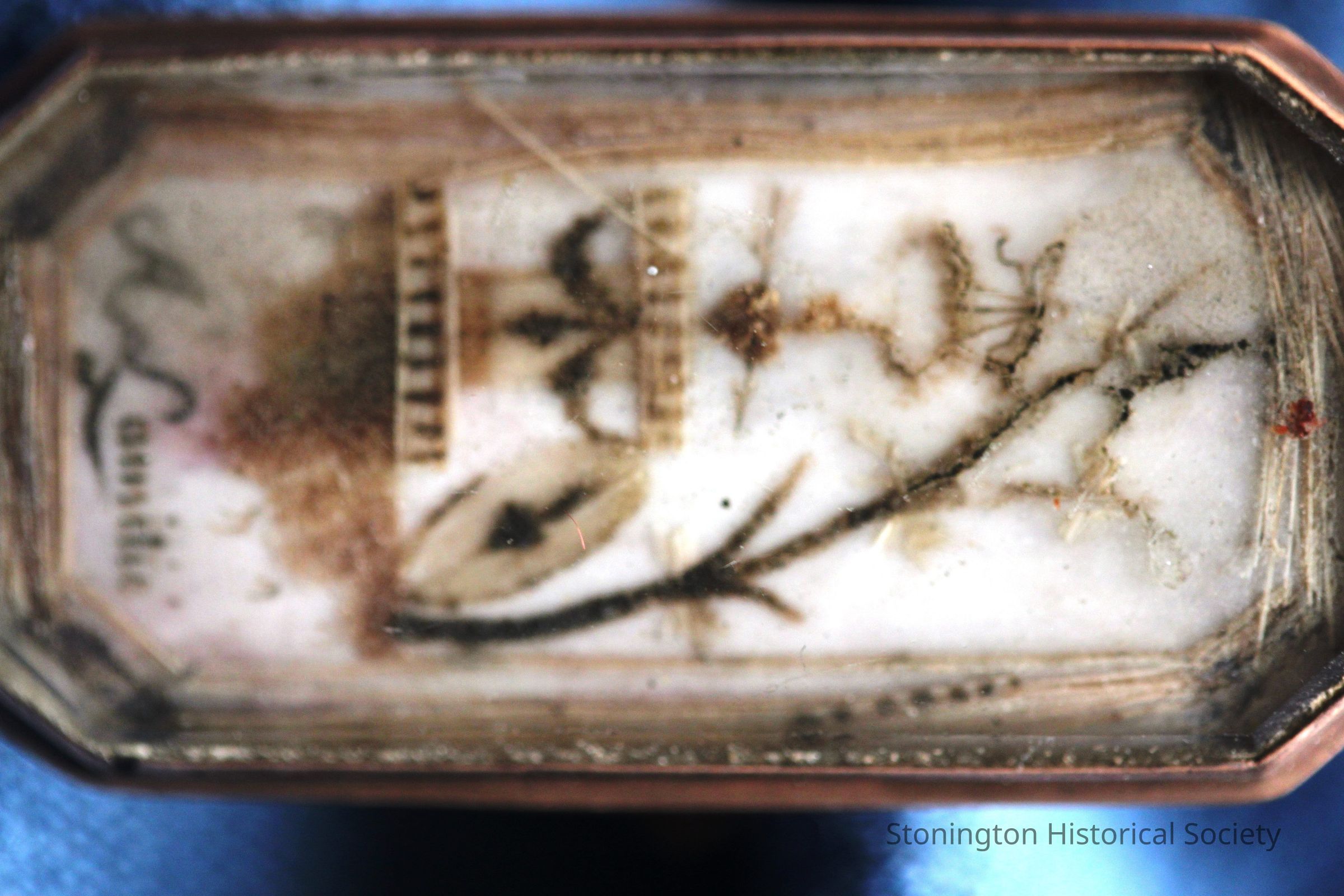 Mourning ring, painted ivory in gold, oblong octagon w/design under glass