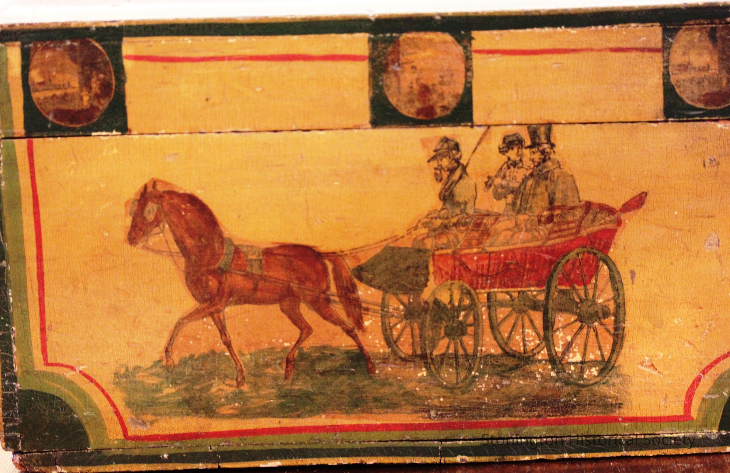 Ornate pine letter box, red and white gingham cloth lining the interior; decals (decoupage) depicting military men, equestrians, cannons, etc. with ladies in carriages.