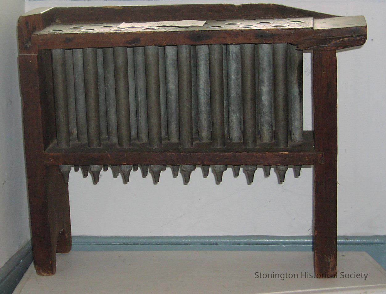 metal candle mold, three tiers, 24 individual molds in wooden frame