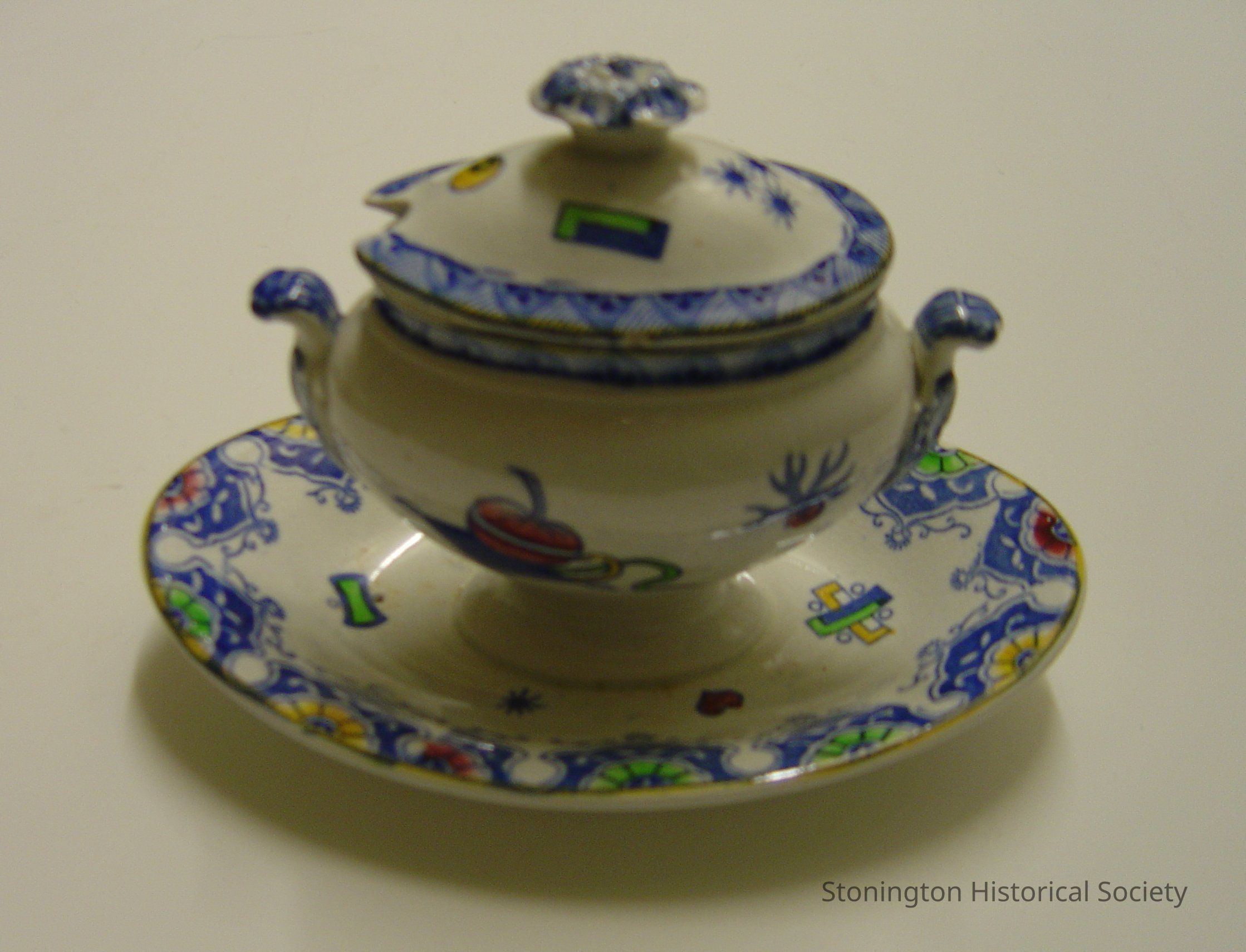 mustard pot, opaque de Sarreguemines ware, 1860, decorated, purchased by Capt. Thomas Forsyth of Mystic on one of his voyages during the 19th-century, in France. Part of a complete service.Collection