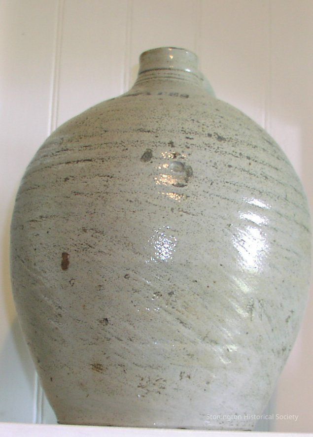 Gray colored stoneware jug marked "A. States." The handle connects from the mouth to the body. Base of the hanndle is blue The top half appears striped.Collection