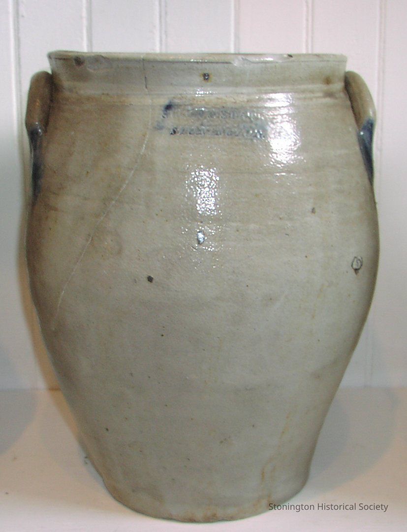 Clay stoneware jar marked "SWAN & STATES / STONINGTON." The jar is gray with blue glaze over the maker's mark and around the handles, which are on either side.Collection