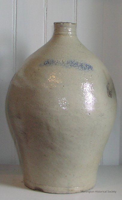 Light gray/off white colored stoneware jug marked " A. STATES & CO" with blue glaze over the mark. The jug has a small mouth with a single handle from the mouth to the body. Blue glaze on the top of the handleCollection