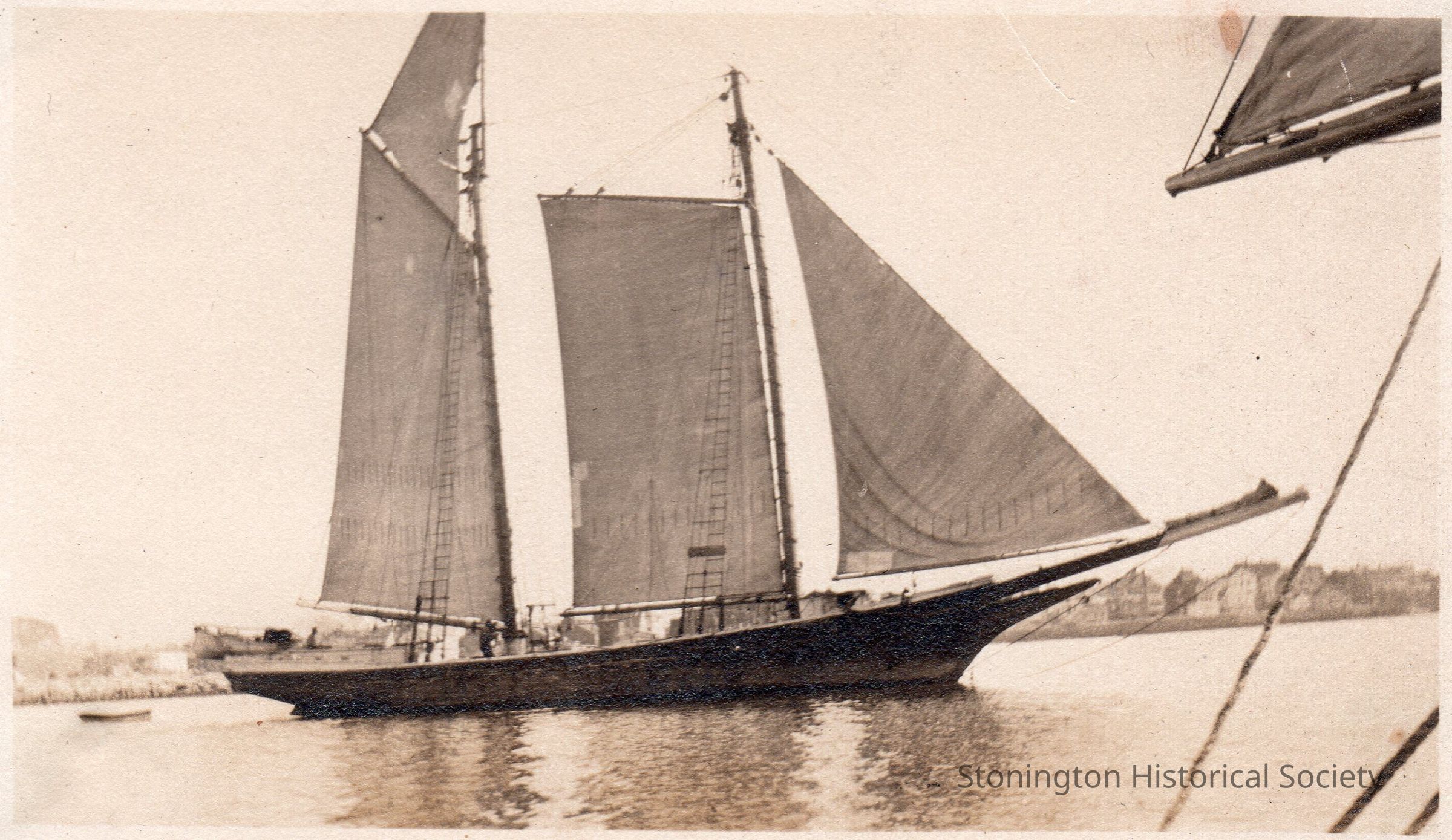 Photograph from the Harry Northup album (2015.019.002), snapshot with enlarged print. Caption from Harry Northrup: "This picture of the coasting schooner heading down harbor is typical of the vessels that used to come into Stonington. She may have brought in a load of coal, lumber, bricks, etc. It shows hard use of the sails with many patches visible. It carries a yawl boat slung over the stern, with a small engine in it to be used when necessary. The two men on deck are probably the total crew. The Yankee owners were pretty frugal, when it came to paying wages and cutting into their profits."Collection