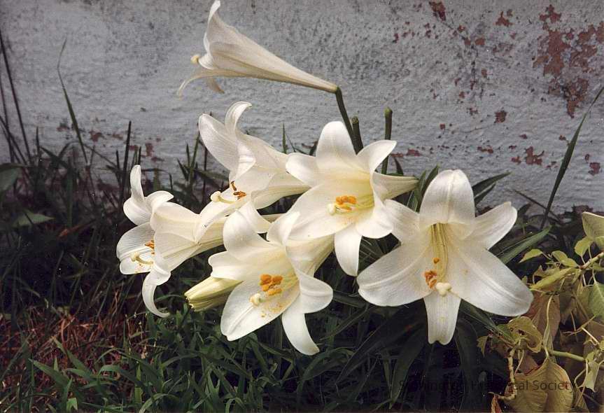 Two photos of small lily near foundation, had 11 blossoms. Taken by Mary Thacher July 1994 In section marked 19 NW Street