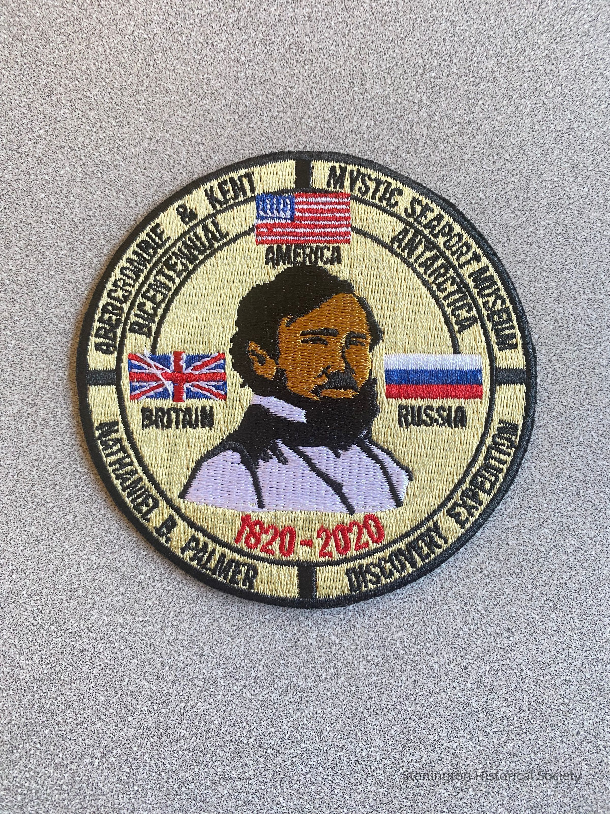 A bicentennial patch created in memory of Nathaniel B. Palmer's expedition that led him to sighting Antarctica in November of 1820. In January 2020, Mystic Seaport Museum sent Alexander Bulazel, Trustee and Chair of the Exhibitions Committee for Mystic Seaport, onboard the Abercrombie and Kent voyage to Antarctica carrying Captain Palmer's ditty box. Captain NB Palmer is depicted on the patch, along with the America, British and Russian flags.Collection