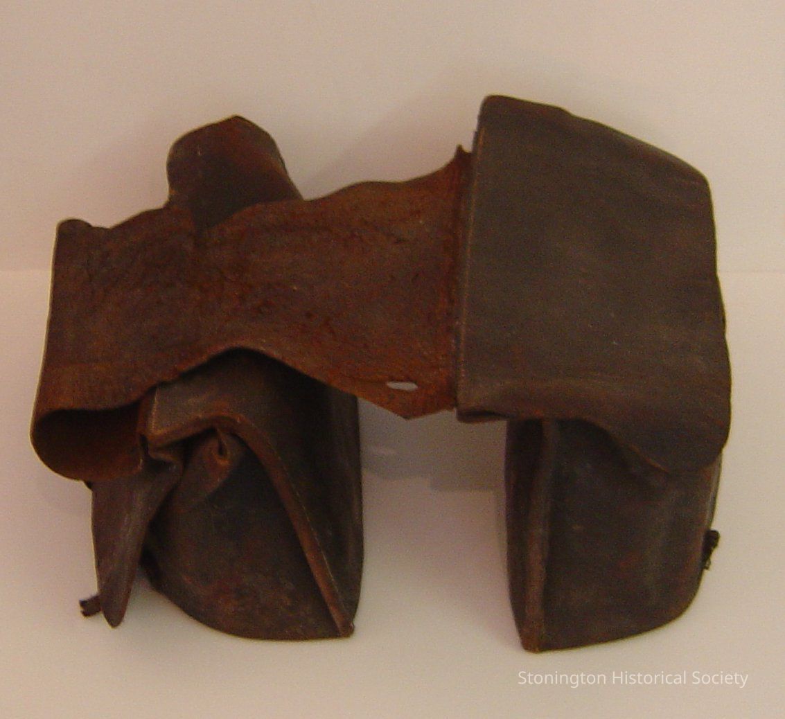 A pair of leather saddle bags, fitted with glass corked bottles of medicine. used by Dr. George E. Palmer and Dr. George D. Santon in the 19th century.