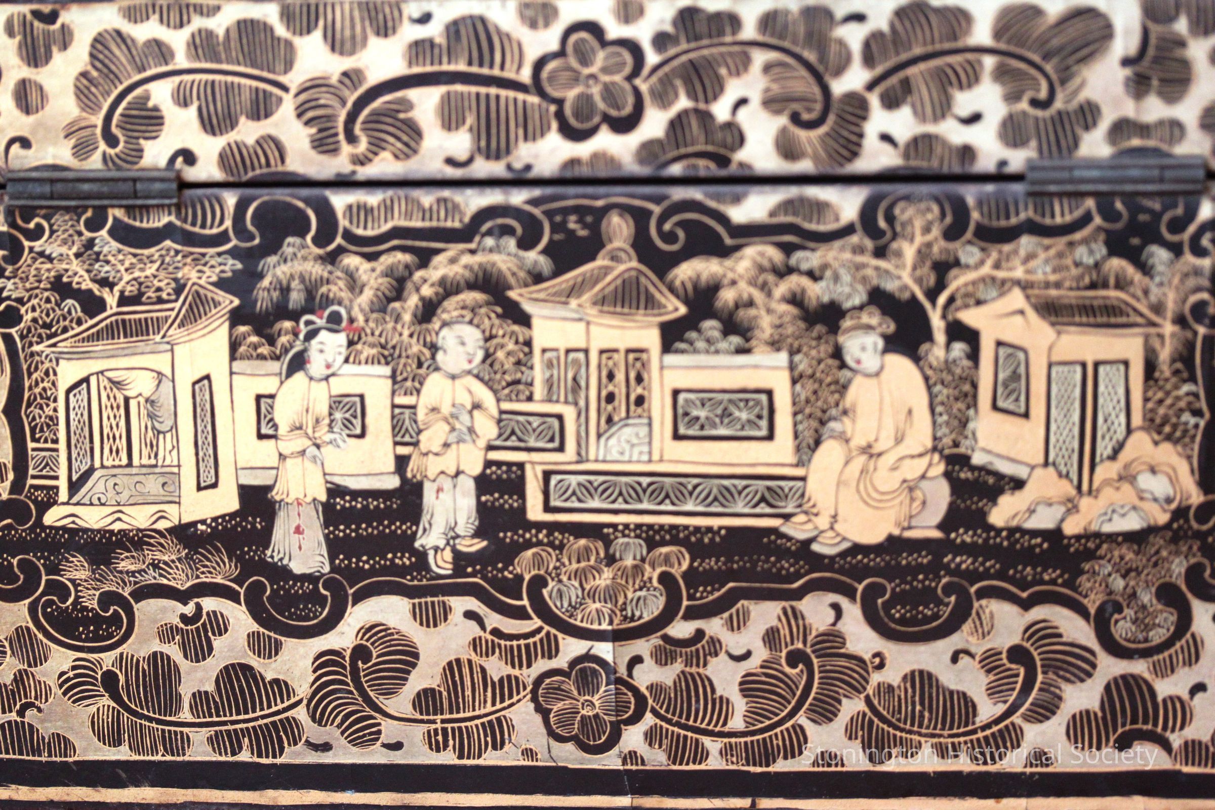 Chinese wooden tea caddy, black laquer with gold decorations, inside are 2 tin lined compartments. Trumbull family.