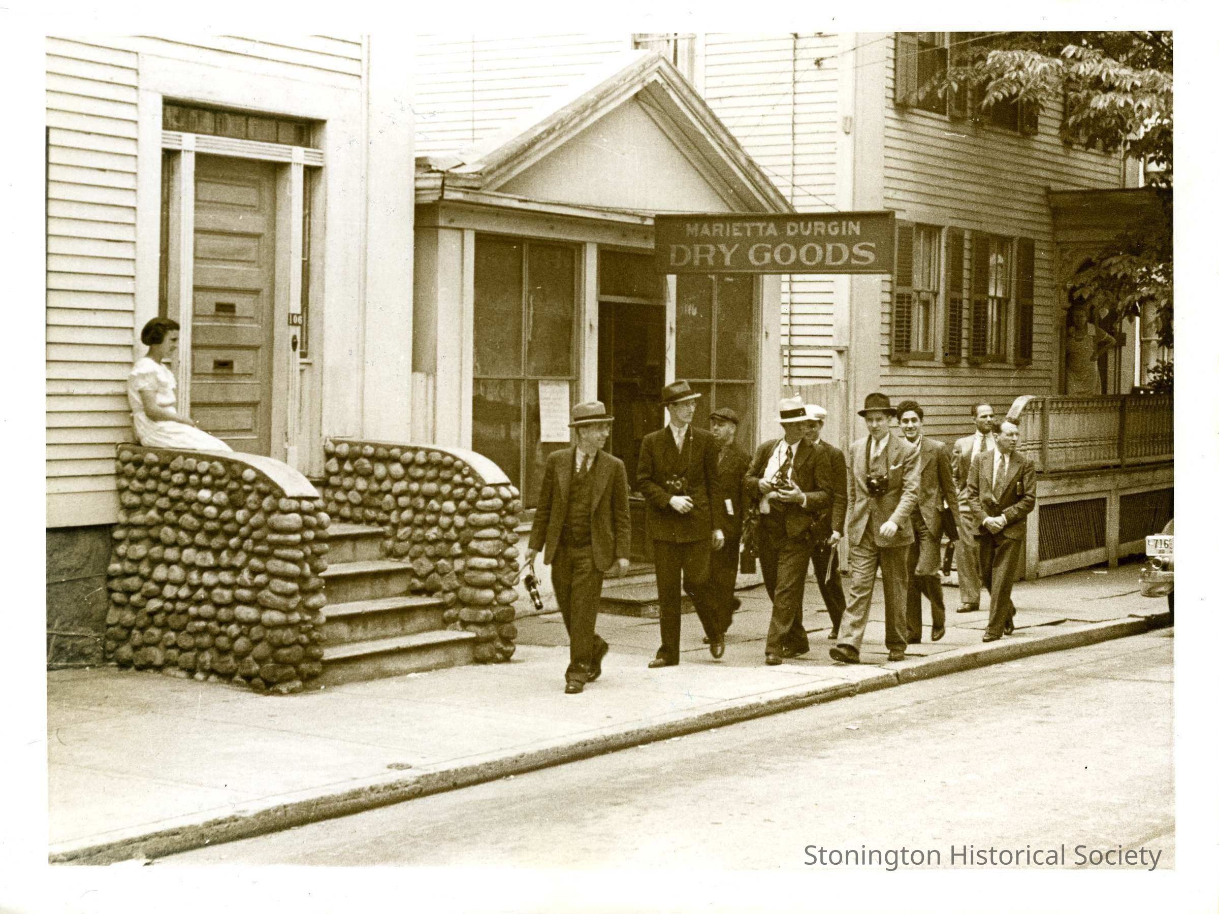 A press photograph of a group of men walking down Water Street in the Borough, in front of Marietta Durgin's dry goods store. They are all dressed in hats and suits with cameras around their necks. A young woman is sitting on her front stoop, watching them approach. Back of the photograph reads: "Camera enthusiasts were afforded a new treat when the New Haven Railroad inaugurated its first 'Picture Train'. The train makes the run from New York City to Stonington, Conecticut, where the cameramen - and many camerawomen - can satisfy their longings for photos in the picturesque town and surrounding countryside. Here the quiet of Stonington on Sunday is invaded by the photographers. The young lady on the left evidently anticipated their arrival. June 22, 1937."Collection