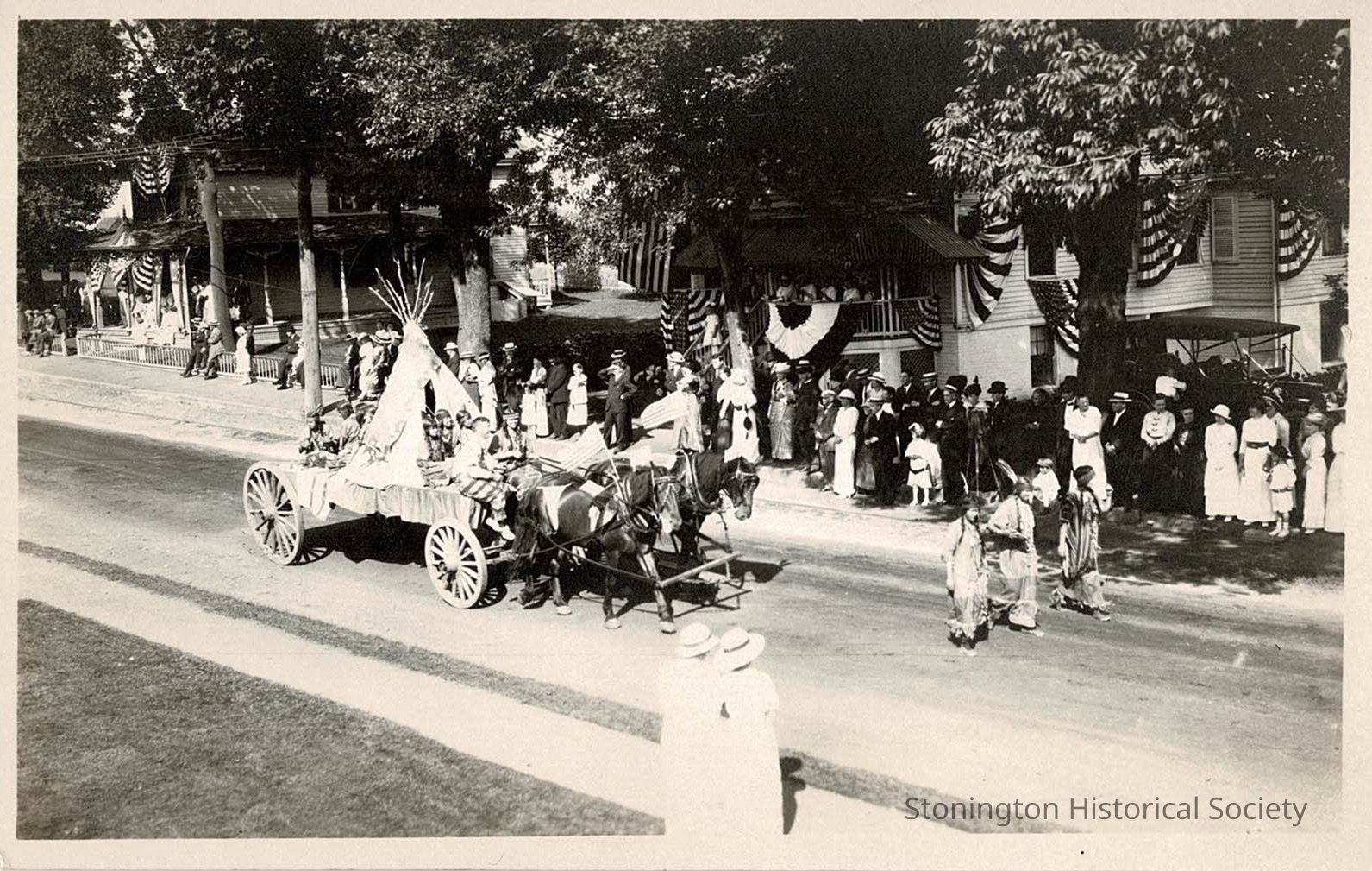 A photographic postcard showing the Camp Fire Girls, dressed as Native Americans, in the Battle of Stonington Centennial Parade in August 1914. Camp Fire Girls was founded in 1910 by Dr. Luther Halsey Gulick, Charlotte Vetter Gluck and their colleagues. It was the first multicultural, multiracial, nonsectarian organization to promote outdoor experiences for girls. They believed girls deserved the outdoor learning experiences that boys had and wanted to help "guide young people on their journey to self discovery."Collection