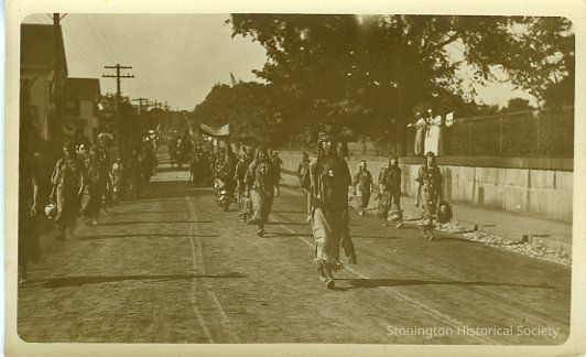 Campfire girls dressed as Indians. Chain link fence on right side. This is on Water Street entering the borough going towards the Point next to the Loper mansion which later became the Post Office site.Collection