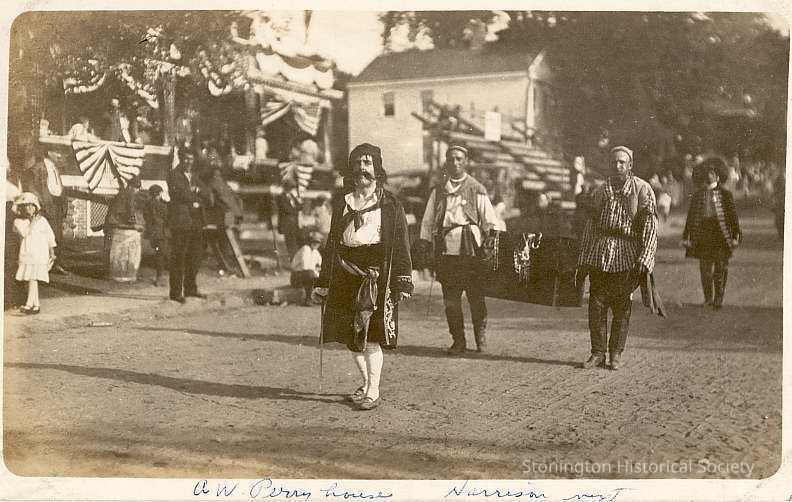 Capt. Kidd and pirates in parade during Celebration of the Battle of Stonington, 1914. T. Whitridge Cutler was Pirate-in-Chief; chest behind him bourne by 3 buccaneers. A. W. Perry house on left with Harrison next. Looking south on Main Street.