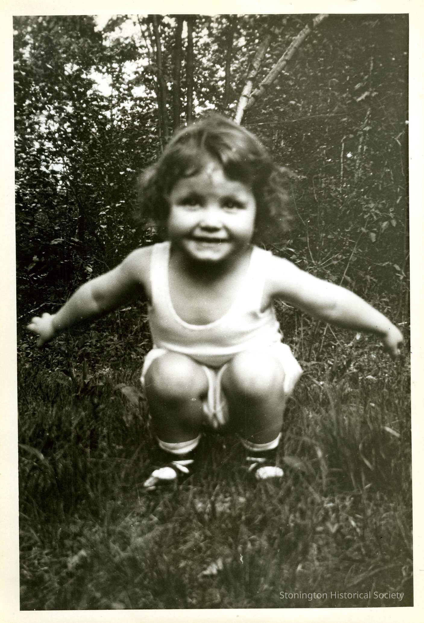 A 5x7 photograph of Carolyn Janet Clark. She is in an undershirt, bloomers, socks and shoes, crouching on the woodline looking at the camera. Best guess is around age 3.Collection