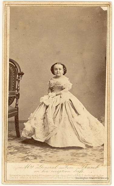 Miss Lavina Warren (Mrs. Charles S. Stratton aka Mrs. Tom Thumb) in a reception dress by Mme. Demorest of 473 Broadway