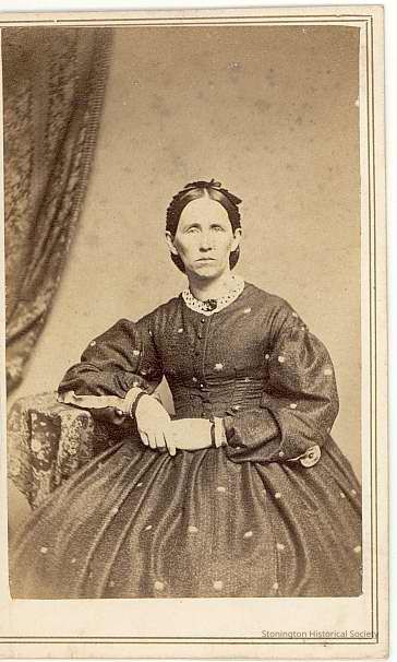 3/4 seated portrait of unidentified woman in dark dress with large white spotted motif, approximately 30 years old