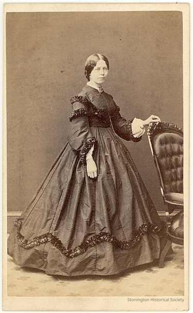 Full length portrait of unidentified woman in dark dotted taffeta dress, cameo brooch, left hand on mahogany side chair
