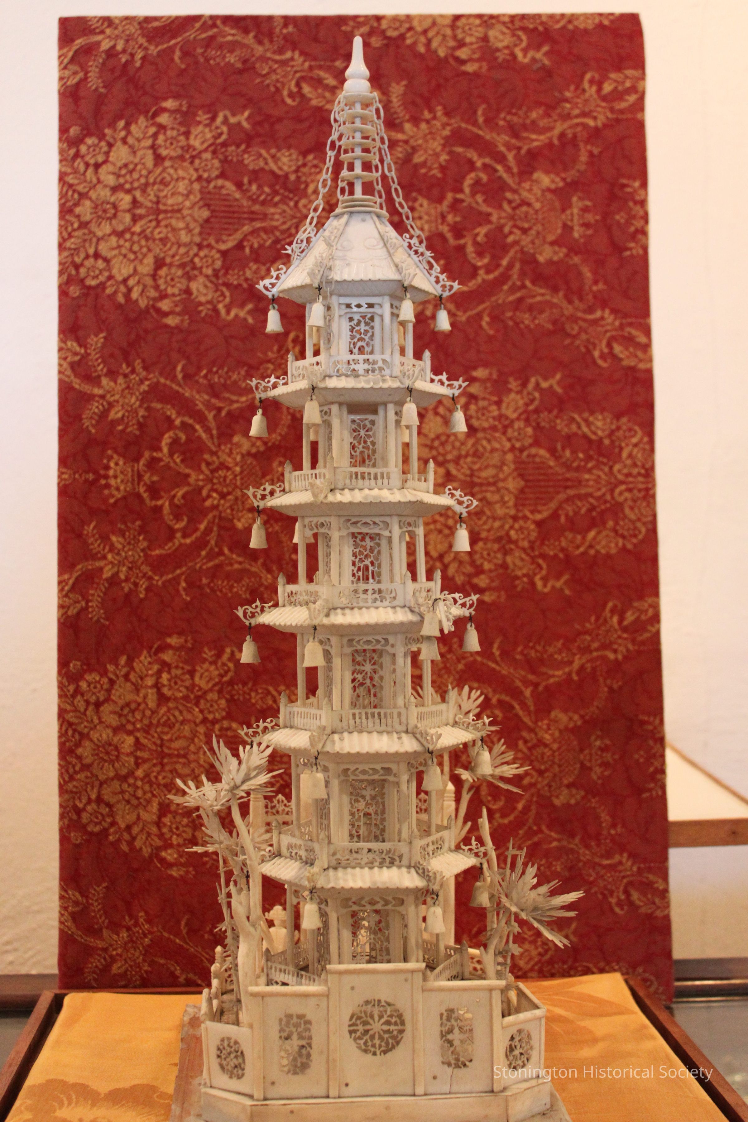 Carved ivory pagoda, Chinese, in case. 6 tiered ivory pagoda, flanked with palm trees and enclosed with a gate. Each tier is comprised of a six-sided screened room with a balcony and alternating screened or picket fences. Each tier is also adorned with bells at each corner. 4 figures - scholars or aristocrats - stand by the front gate. The pagoda sits in a fiberglass case which fits into a wooden frame at the bottom. It is backed with a red and gold silk brocade fabric.