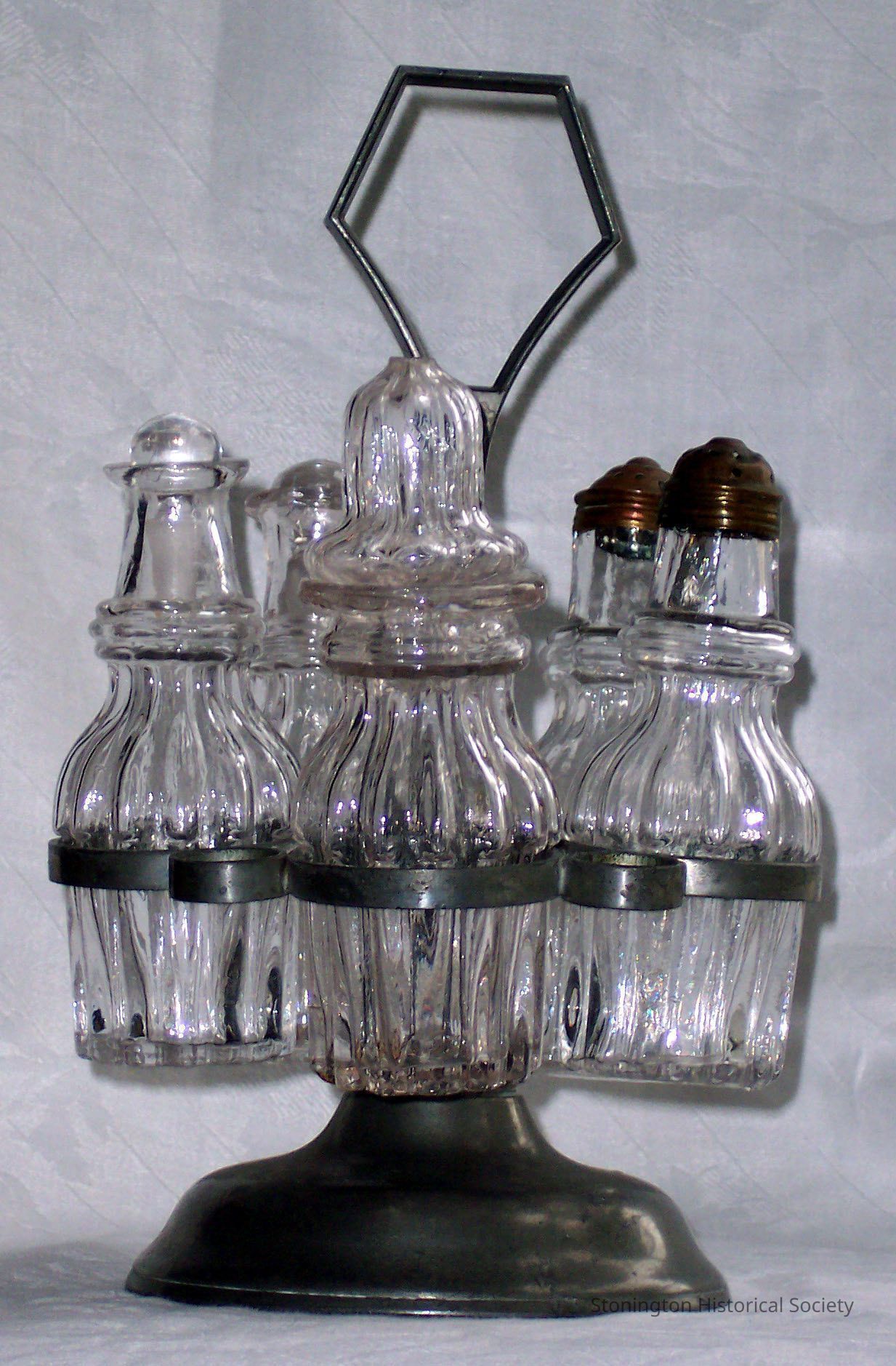 Caster set with 5 glass bottles, made of pewter or possibly britannia ware. The salt and pepper glass bottles have brass tops and the three other galss bottles have glass stoppers. The caster itself has a hexagon shaped handle and and smaller circles connect the glass holders to one another. One of the glass bottles has a chipped bottomCollection