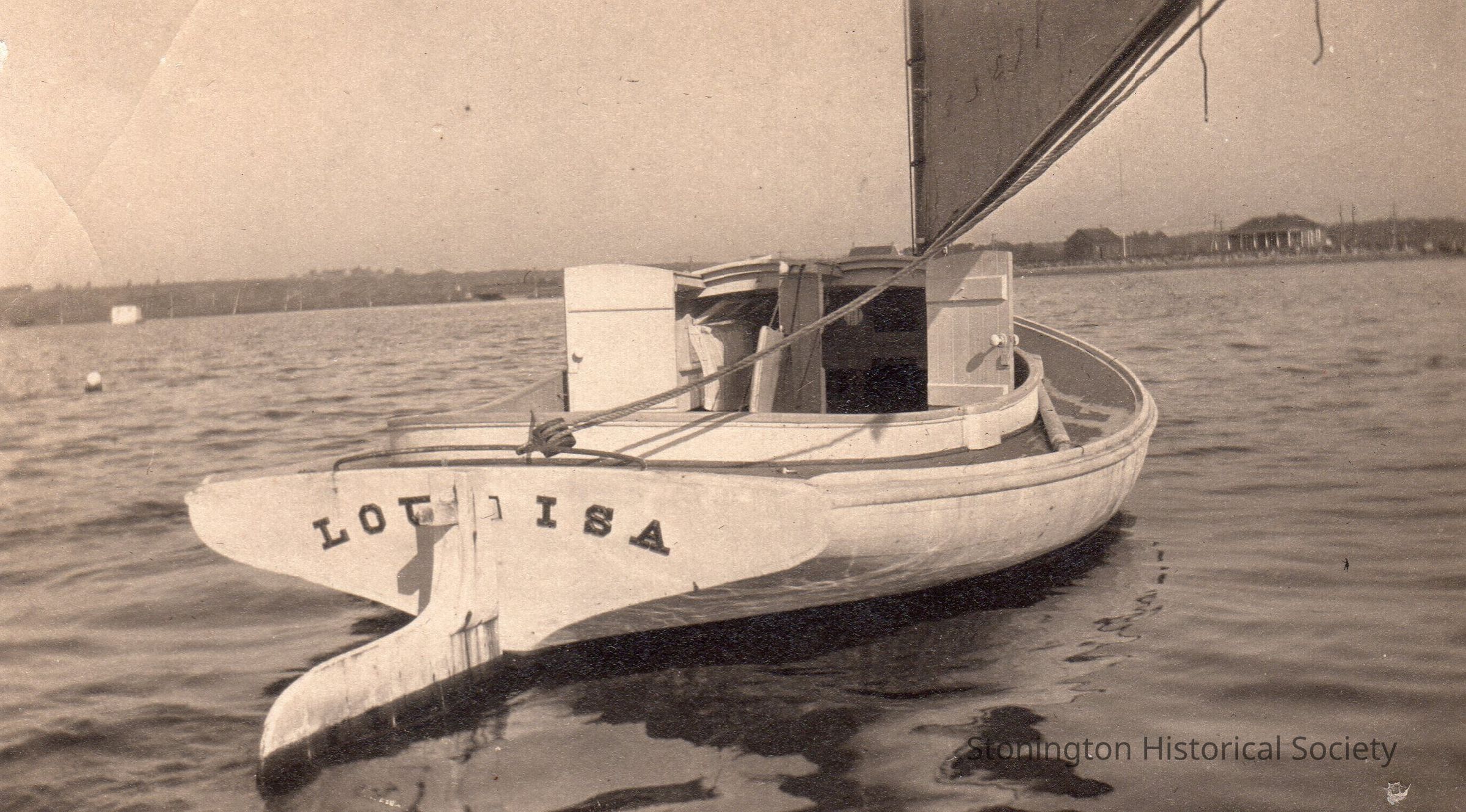 Photograph from the Harry Northup album (2015.019.002), black and white snapshot (with enlarged print). Caption from Harry Northrup: "This is a picture of the catboat LOUISA. Probably built before 1900. It is owned by Harry A. Northrup in this photo. Note the double cabin doors. The centerboard trunk was so big it separated the cabin into sections."Collection