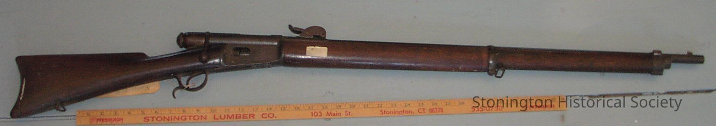 firearm, Swiss Vetolli Rifle, .41 caliber with movable sight. Inscription reads "Waffenfabrik Bern, 181682, M .78" Makers Mark:D3+CI under stock, M insignia, bolt action, inspection marks on breach and end of stock.Collection