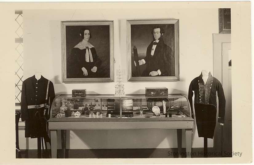 Room at Stonington Historical Museum showing two portraits and uniforms and display case. Interior of the main gallery of the Old Lighthouse Museum.