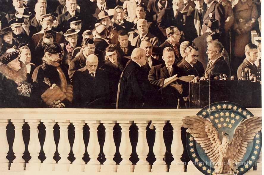 Close-up of reprint of color photograph that was in the Toledo Sunday News on Feb. 2, 1941 showing Franklin D. Roosevelt being sworn in as president for the third time.