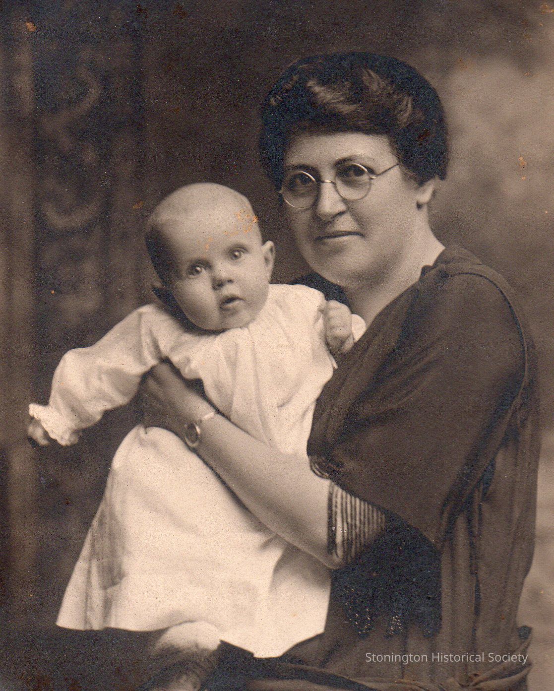 Photograph portrait, in board frame, of Fannie Fish Noyes (1888-1955) with her daughter Corinne Noyes (Breed), taken by George Tingley, Mystic. She was the daughter of Walter and married Charles Frederick Noyes in 1920.