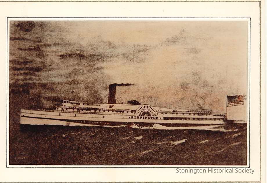 The steamboat "Stonington" under way. Information on back of card tells of the accident between "Stonington" and "Narragansett" during dense fog.