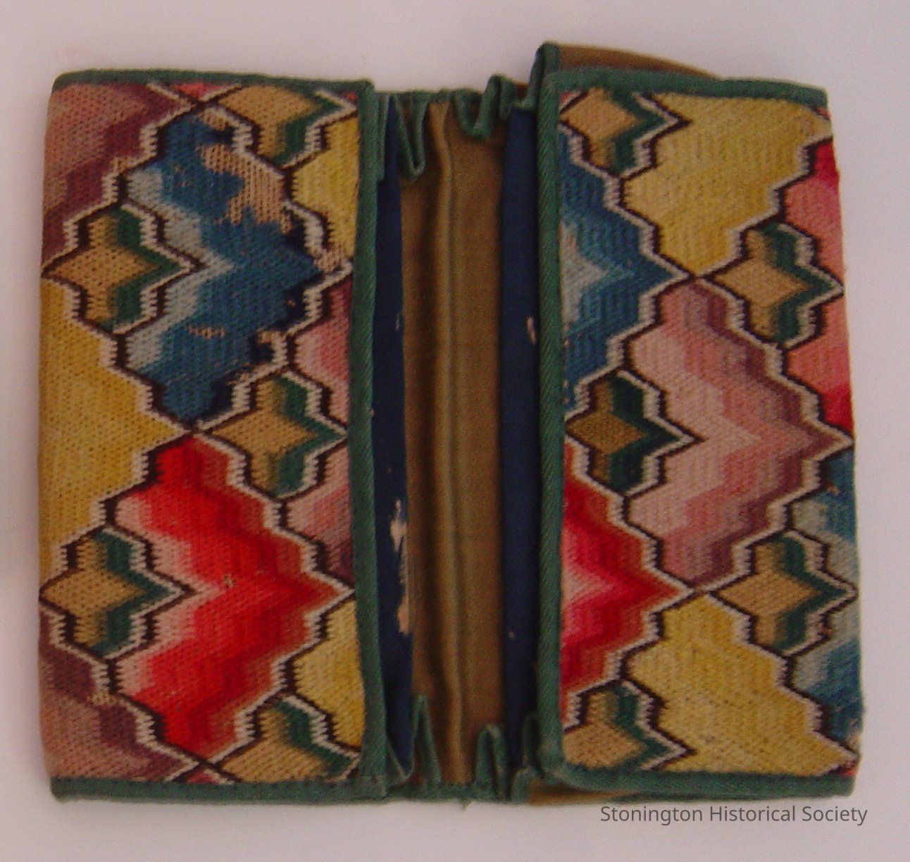 double pocketbook or letter case owned by Captain John Randall (1730-1802), wool on canvas bound with twill tape, flame stitck (known as "Irish stitch" in 18th cent. America).Collection