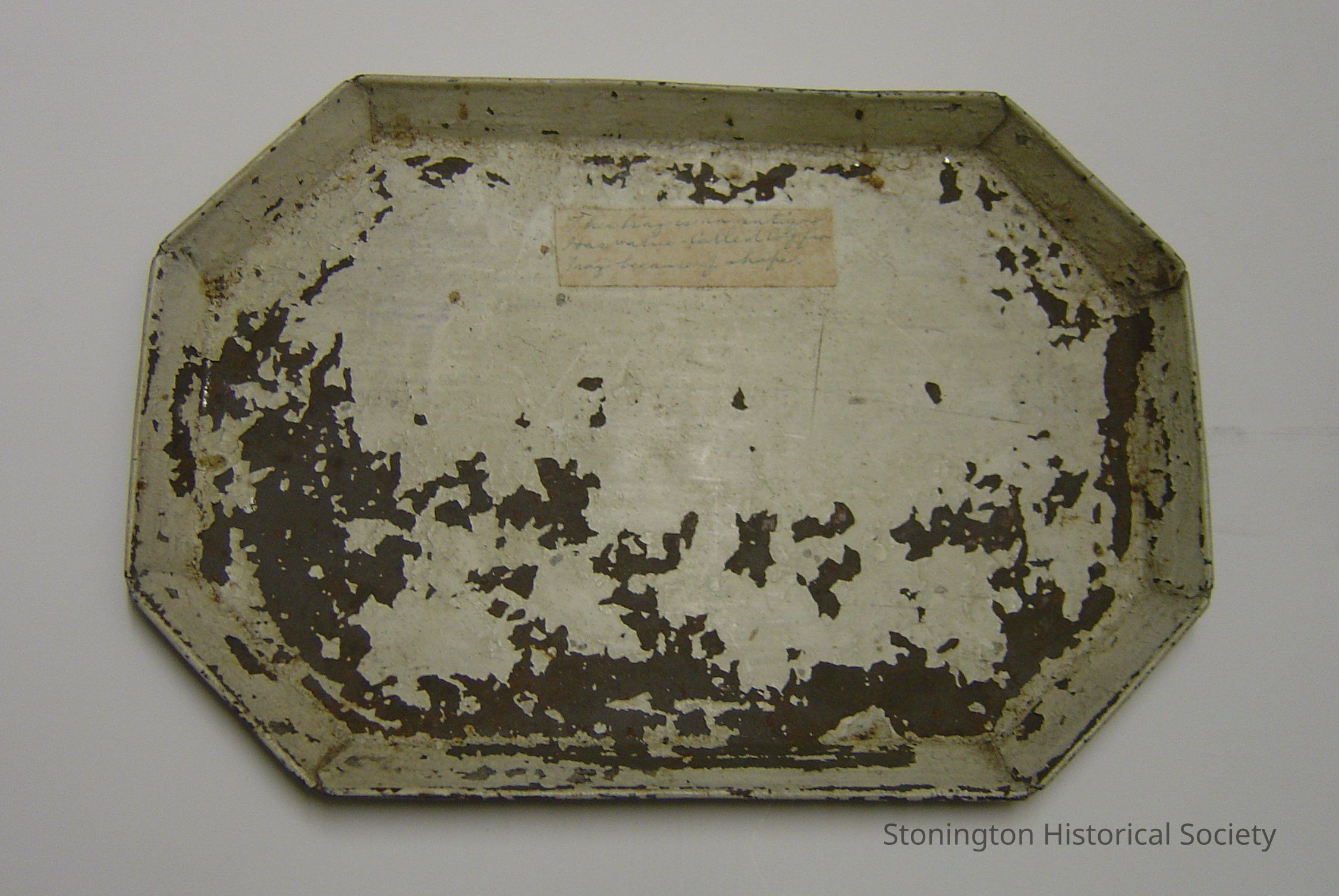 coffin tray, named because of its shape, tin tray painted white