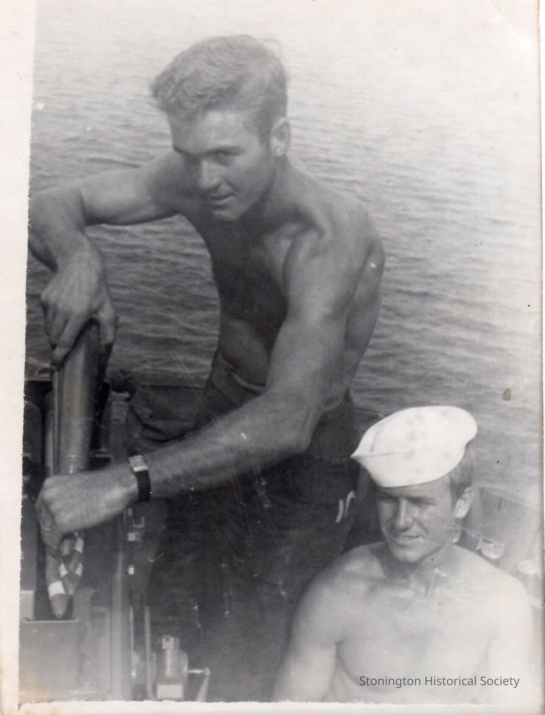 Black and white snapshot from the photograph collection of Frederick Eugene Weeks. Handwritten on back: "BRYANT GM 2/C, LOADING A 40 MM - HUCK Y 3/C (WITH THE HAT) BOTH DARN NICE FELLOWS - I THINK WE HAVE ONE OF THE BEST CREWS OF THE WHOLE AMPHIB FLEET!" (GM 2/C - Gunner's Mate, 2nd Class). Weeks was born in Stonington on March 16, 1922 and served with the U.S. Navy in the Pacific Theater during WWII.