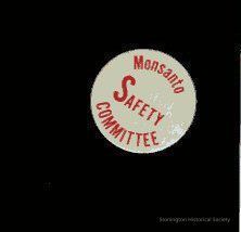 Round metal pin, white with red lettering "monsanto SAFETY COMMITTEE"printed. Back has round tie-clip type of fastener