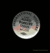 Round metal pin, silver with black printing. International Molders (around edge) and Allied Workers Union AFL-CIO (printed horizontally).
