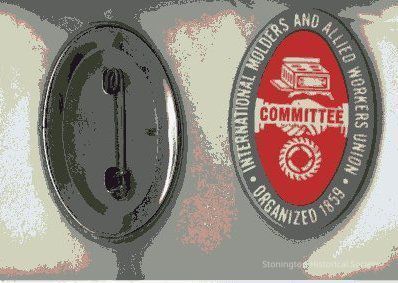 Oval metal pin, red, white and blue background with red and white printing. International Molders & Allied Workers Union Organized 1859(around edge) and COMMITTEE (printed horizontally) with shaking hands behind and two symbols above and below.