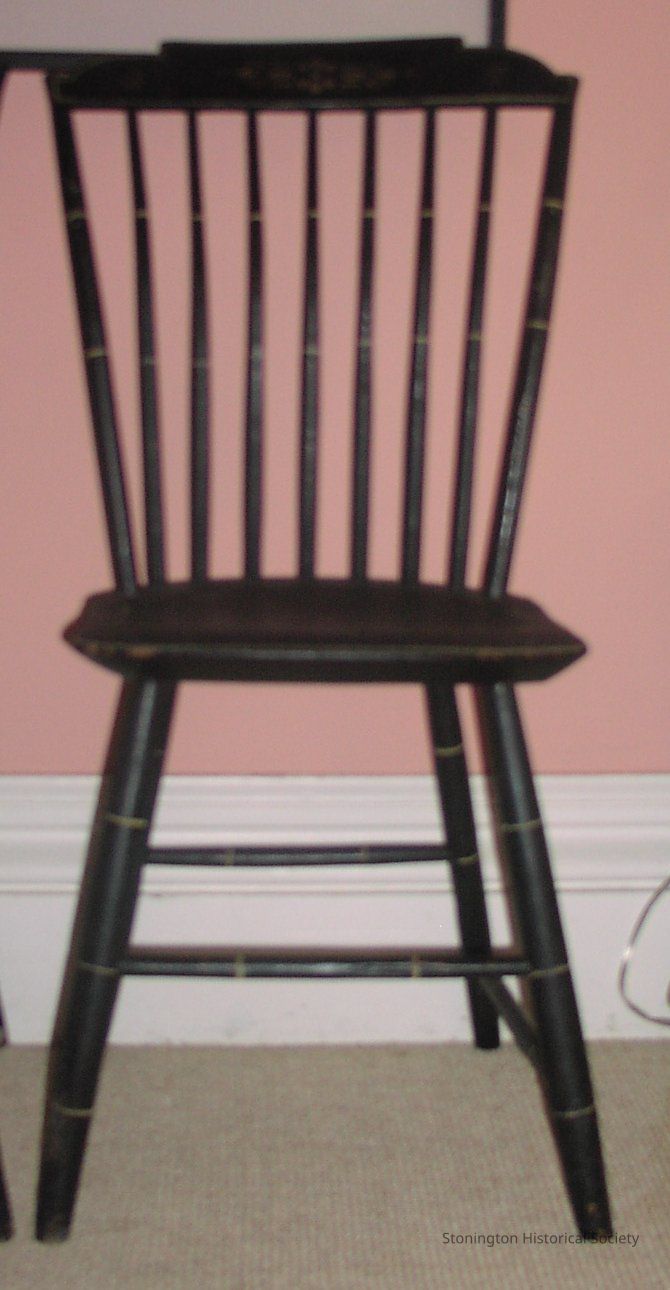 Black wood Windsor side chair, 1 of 4, stepdown. Nine spokes make up the back of the chair. A flower stencil in gold is on the back, while the legs and spokes have rings of gold.Collection