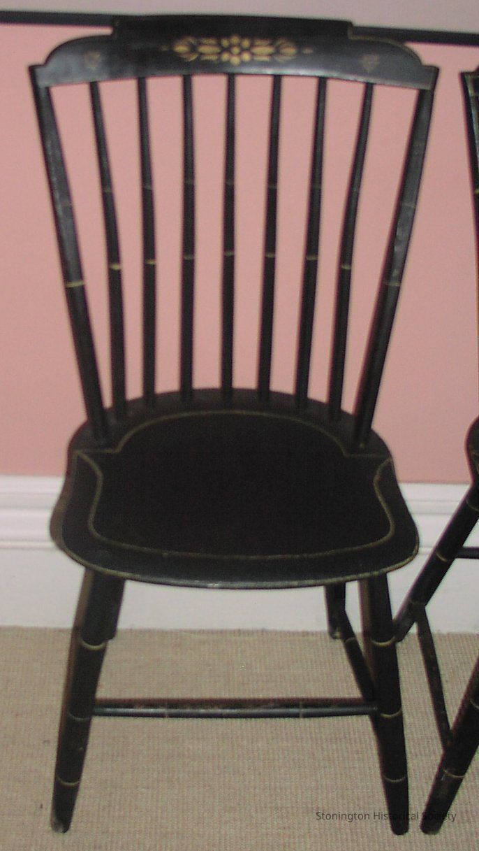 Black wood Windsor side chair, 1 of 4, stepdown. Nine spokes make up the back of the chair. A flower stencil painted in gold is on the back, while on the legs and spokes are rings of gold.Collection