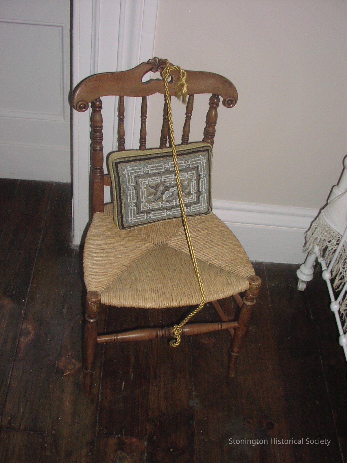Child's wooden chair with rush seat; eastlake style rail trim with decorative hole in top rail for easy carrying; spindle back.
