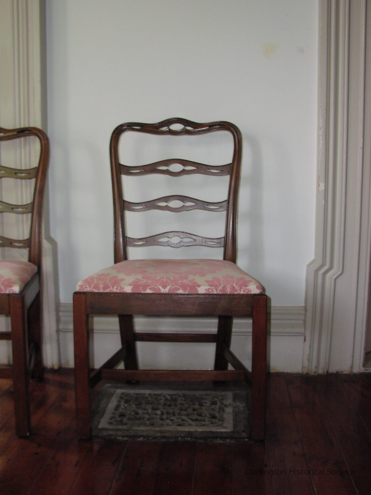 One of pair of mahogany pierced ladder back chair, with pink & white brocade upholstered slip-seats. On bottom of chair number 89.2-2 found. Ladder back of chair has three 'rungs' with decrative design cut through the wood. The seat of the chair is pink and white floral design.Collection