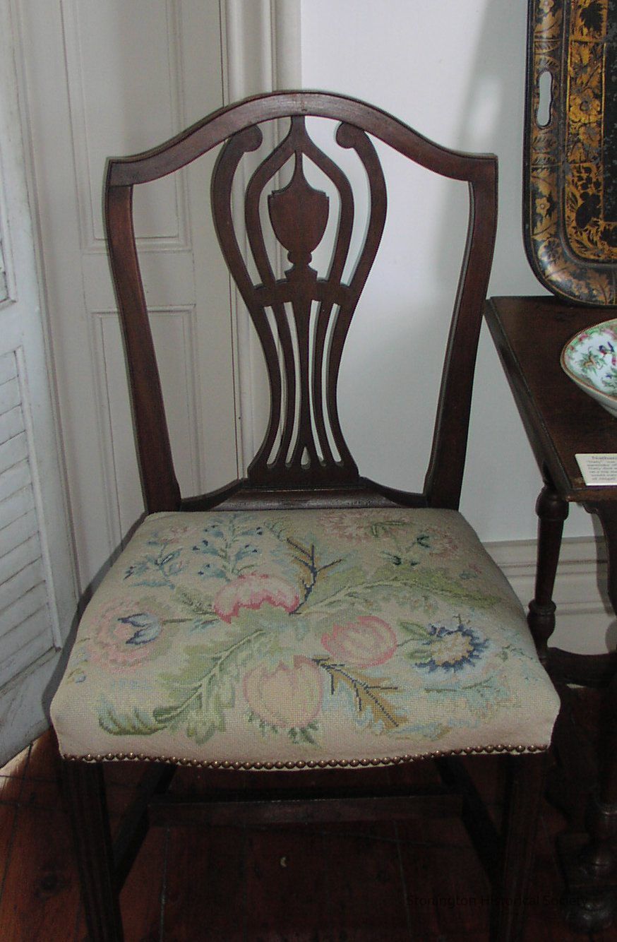 Mahogany side chair, one of pair; Hepplewhite style, said to have been made in Norwich, CT c. 1790. Seat cushion needlepoint made by Alice Jewett in 1986-87. Shield back with cutouts.Collection