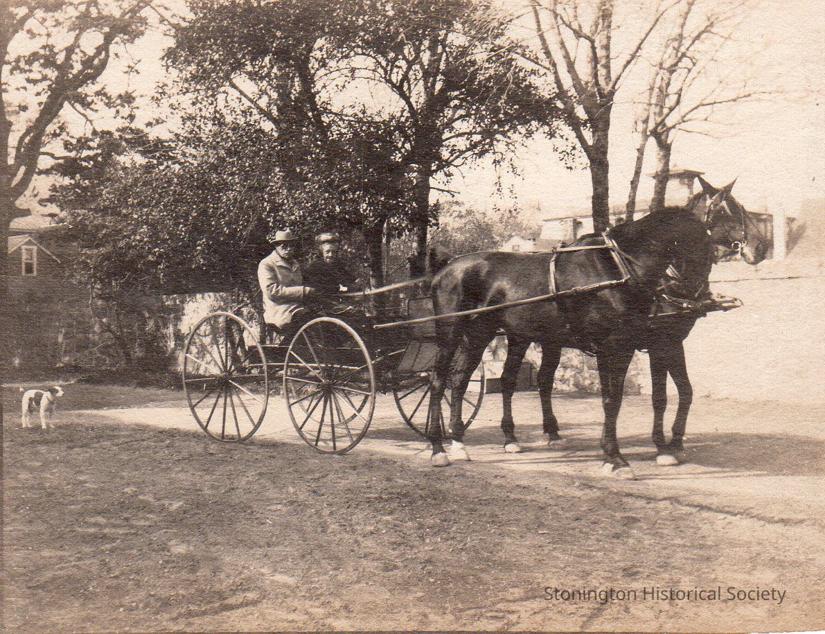 Black and white photograph of Chandler Norton Wayland and Lucy Elton Wayland, on a horse drawn carriage, 1907. Lucy's dog Snip can be seen on the left. The Wayland's lived in the Charles Phelps Williams House, 39 Main Street, Stonington.