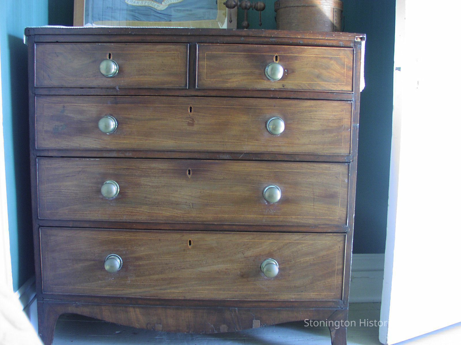 Heppelwhite chest with five drawers-- two small drawers on the top and three long drawers on the bottom. Each drawer is outfitted with brass knobs that aren't original to the piece.Collection
