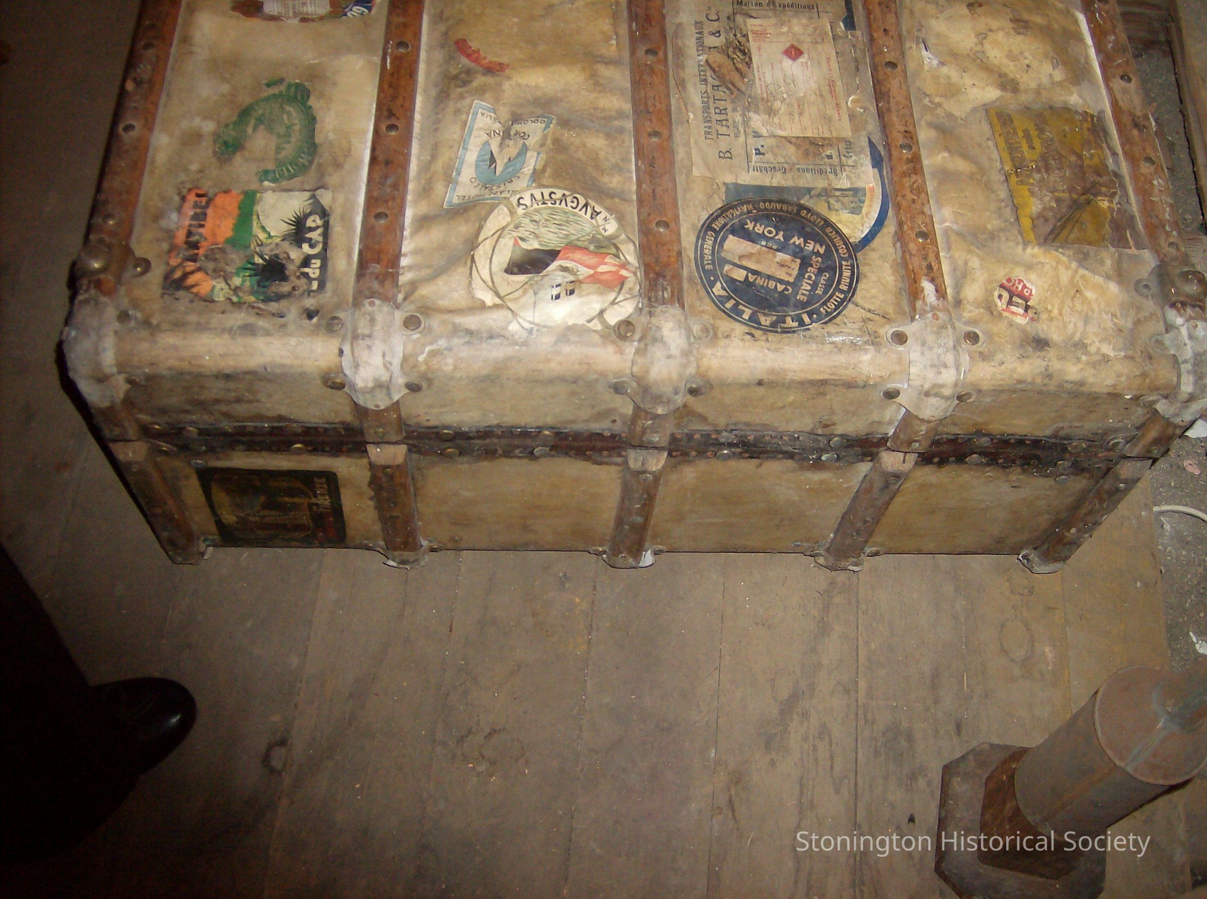 Small wood trunk, leather covering with travel stickers