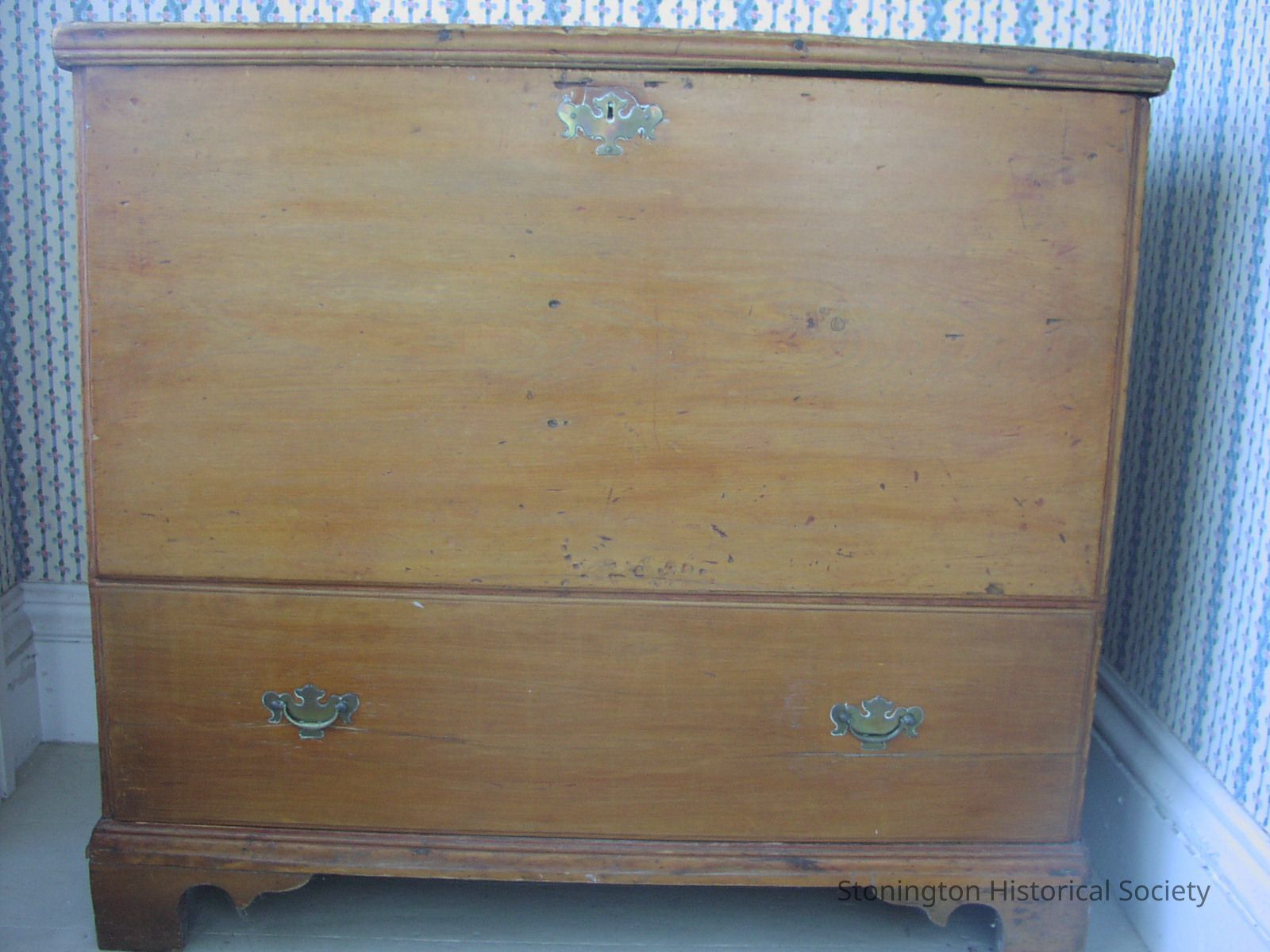 Pine blanket chest, lift top, single lower drawer, brasses added & feet replaced, c. 1780. Source as on card: (Hurlbut) E. H. Cole